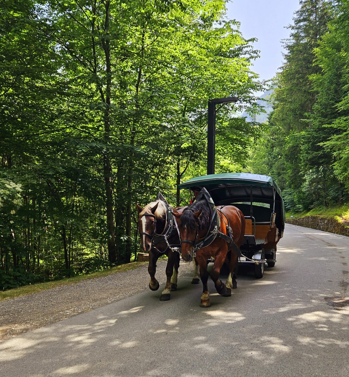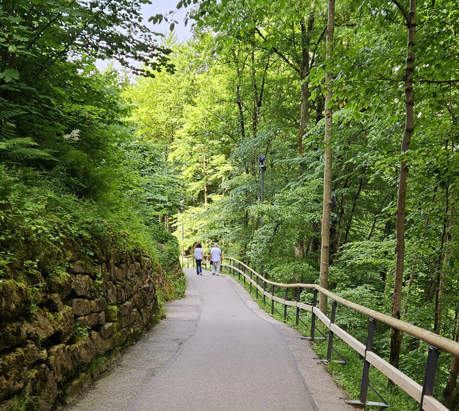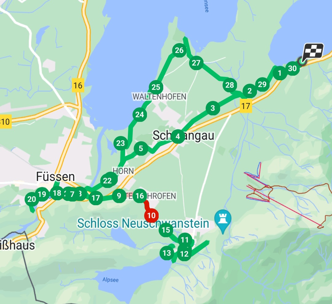 Vi syklet ca 2.5 mil på sykkelstier uten å måtte inn på taffikerte veier. Vi besøkte to slott, gamlebyen i Fussen, Alpensee og en foss. I tillegg gikk vi ca 5 km på beina og nesten 200 høydemeter i 30 varmegrader…. Men én flott dag i Fussen!