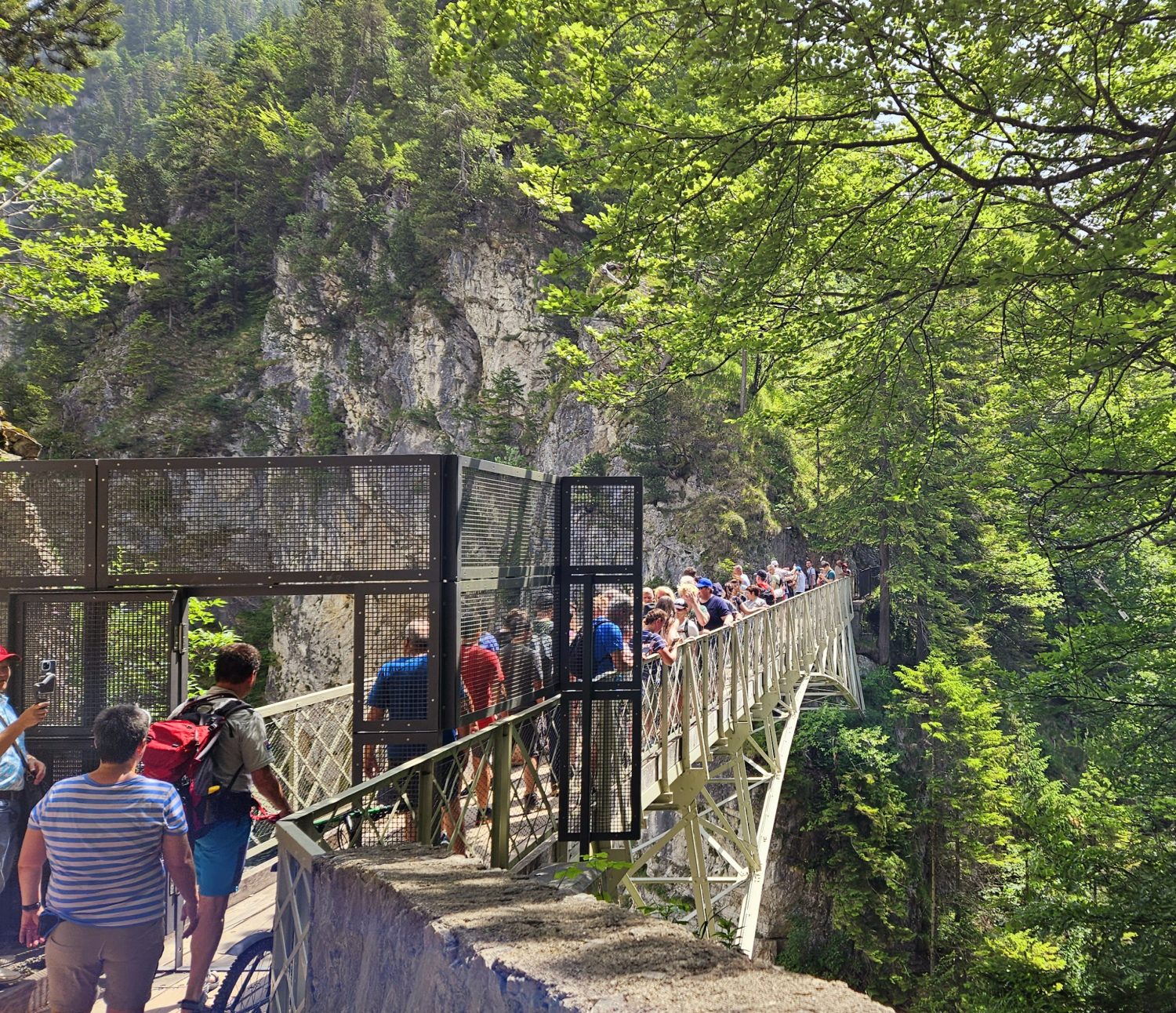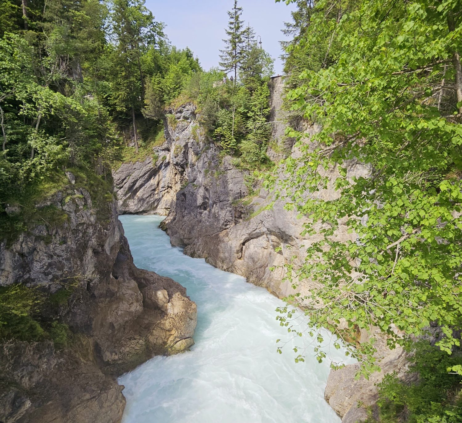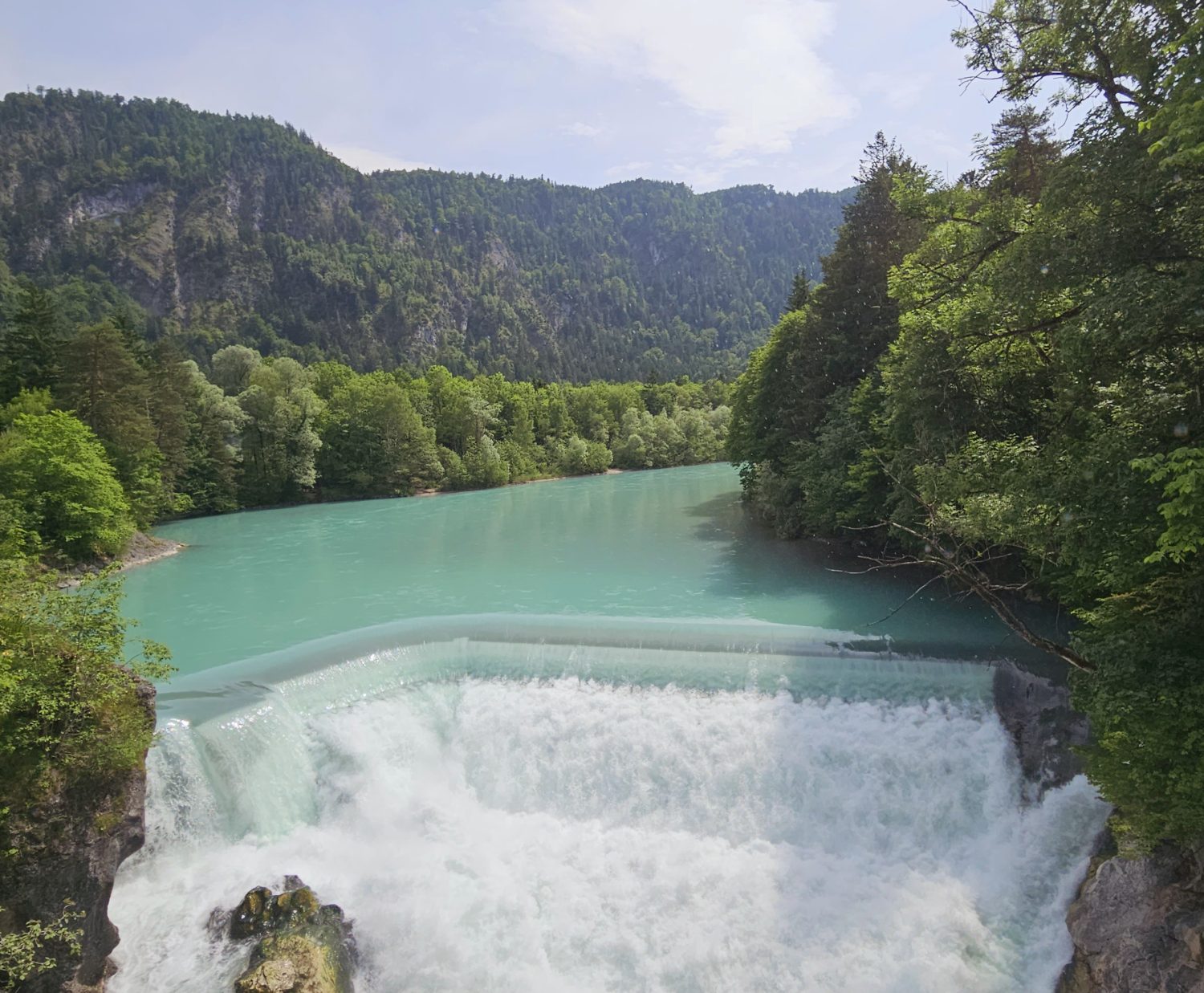 Vi syklet langs elven Lech opp til Lechfall. Fra gangbroen er det flott utsikt til både fossen og ravinrn med den knallturkise fargen.